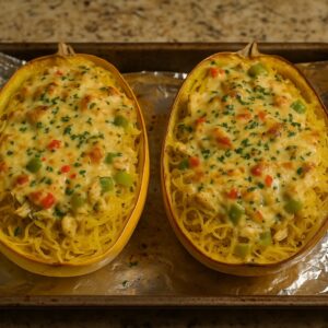 - Preheat oven to 400°F (200°C). Place squash halves cut-side down on a baking sheet lined with parchment. Roast 35–40 minutes, until tender. Scrape flesh with a fork into strands.