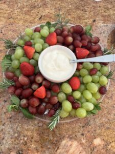 Simple, elegant, and festive—grapes, strawberries, and sprigs of rosemary arranged in a wreath shape with a light yogurt dip in the center. Beautiful on any table and so easy to make.