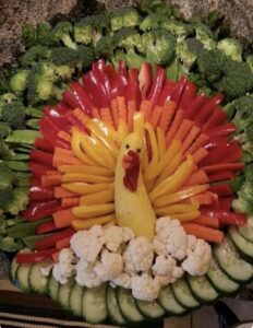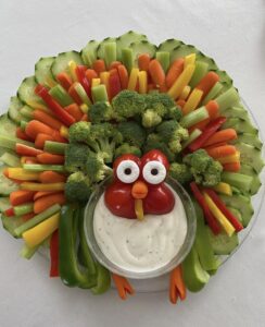 Fun for the whole family! A “veggie turkey” tray made with cucumber feathers, peppers, broccoli, and carrots around a bowl of dip. Kids love helping design this one!