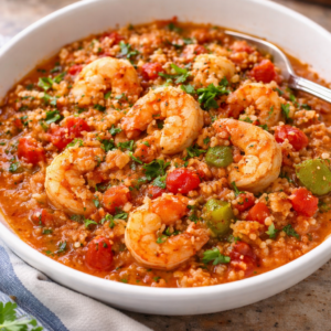 A lighter shrimp jambalaya made without oil, roux, or rice—packed with bold Cajun flavor and ready in 30 minutes.