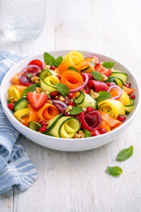 This ribbon salad transforms everyday vegetables into a beautiful, fresh dish that feels special without extra effort. Using a simple mandolin slicer, you can create soft, curled ribbons that make eating vegetables more enjoyable and visually appealing.